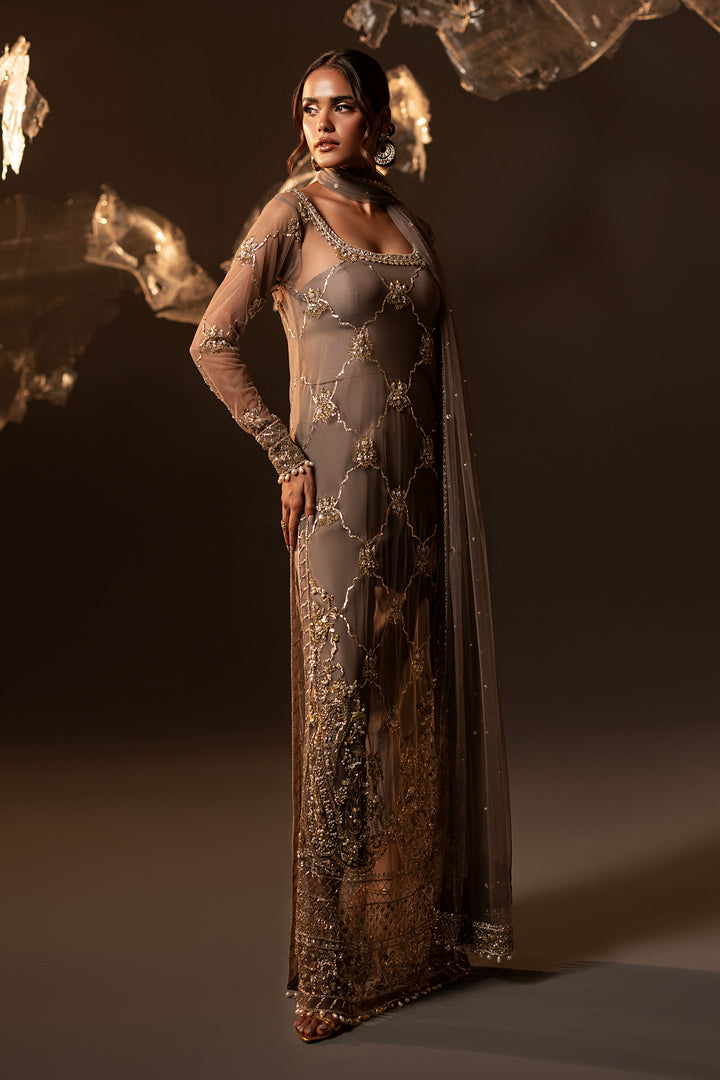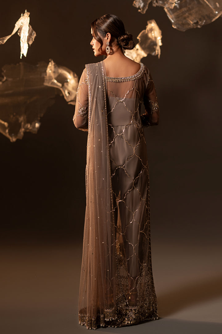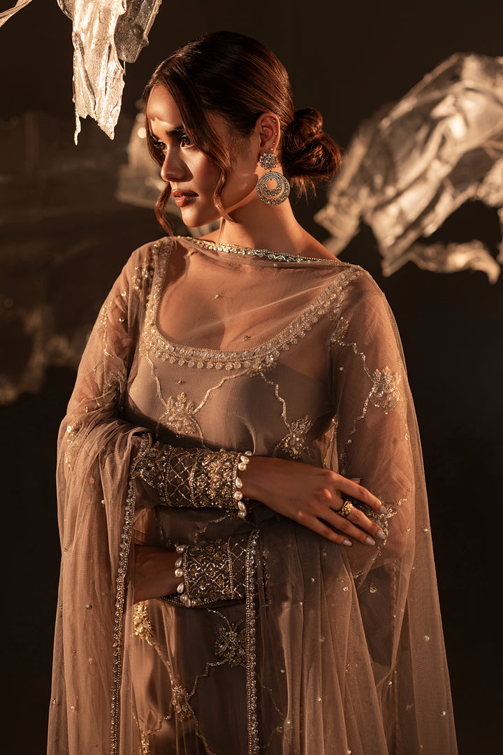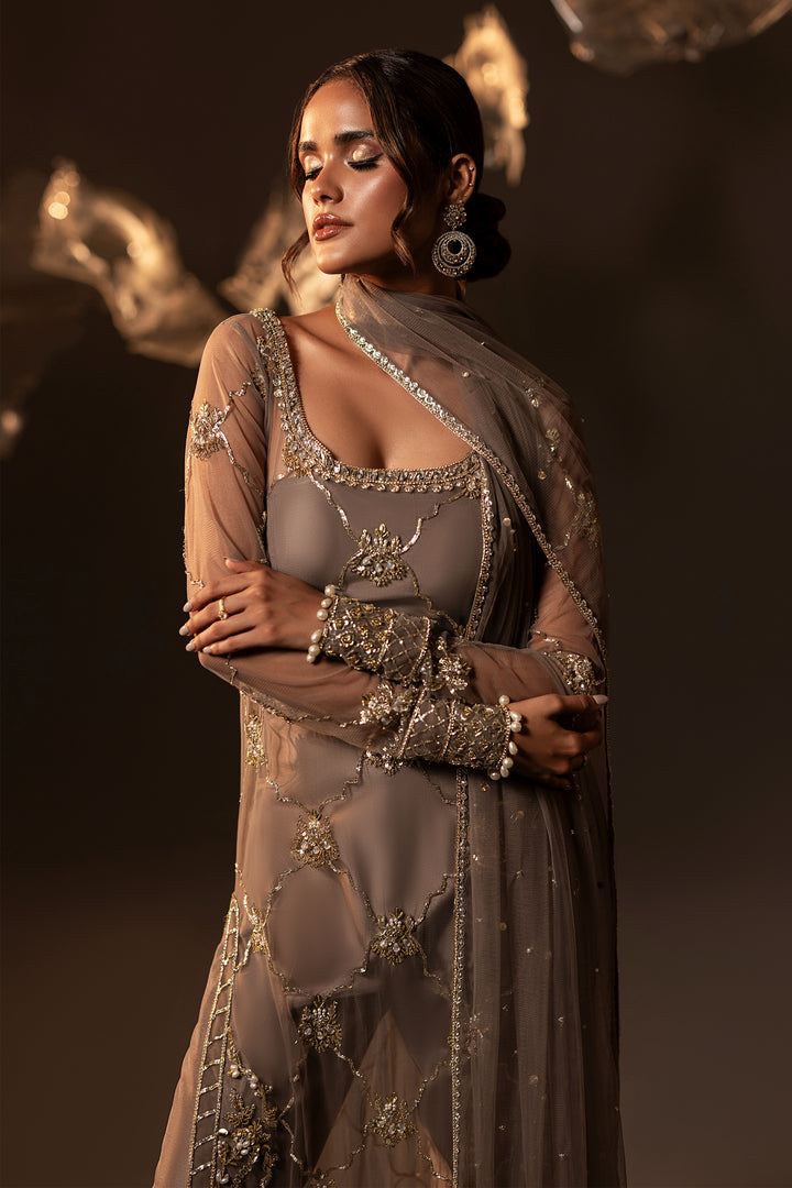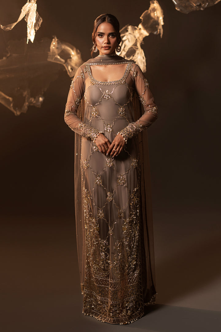 An artistic ode to timeless craftsmanship, this net straight long shirt with pure raw silk capri is exquisitely hand-embellished with hammer work naqshi, delicate sequins, lustrous pearls, and intricate chain work. Shimmering Swarovski and crystals elevate the ensemble with radiant brilliance, while the regal touch of Ganga Jamni artistry breathes heritage into modern elegance. A masterpiece that speaks of grace, luxury, and enduring beauty.