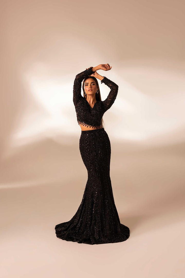 A vision of couture artistry, ethereal mesmerizing black skirt, hand-embellished with Swarovski, pearls, naqshi, sequins, and cut stones, reimagined in dramatic skirt and statement blouse. An eternal ode to elegance and modern glamour.